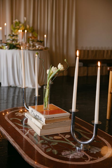 I wanted to prominently feature lace tablecloths (lace is so back). After a trip to the beautiful Schweitzer Linen, a luxury Italian linen supplier that’s been around for over 50 years, and an attempt to play it cool once hearing the prices, the stars aligned at the Gohar World sample sale. Based on their vibe, I had a good feeling if I got there early enough I could find what I was looking for. Alas, the stars did in fact align. Not only did I get my eyelet tablecloths, but also these incredible GIANT candles. They were so heavy that we had to tape the holders down to the table plus put copious amounts of floral tack around the base of them to hold them in place. Even then, the fear of a fire emergency lingered all night. WORTH IT.